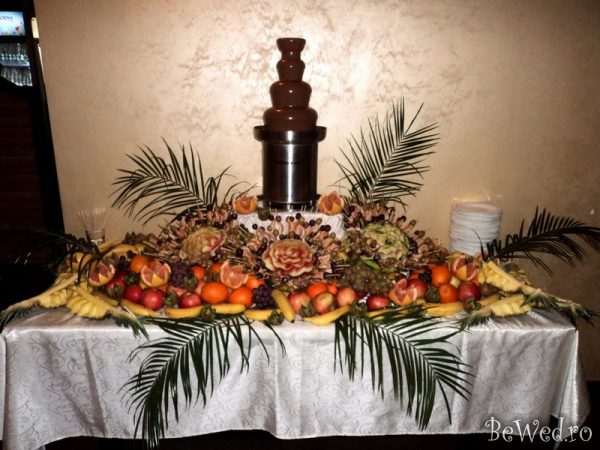 Fantana de ciocolata este o surpriza dulce pentru suprinderea invitatilor dvs. si aduce un plus de rafinament evenimentului, fie ca este folosita la un botez, o nunta eleganta in aer liber, o petrecere corporate sau o petrecere restransa in familie. De asemenea, puteti opta pentru un aranjament spectaculos ce cuprinde fructe sculptate, sculpturi in fructe, pepeni sculptati, aranjamente din fructe in diferite forme, completate de aranjamente florale.
