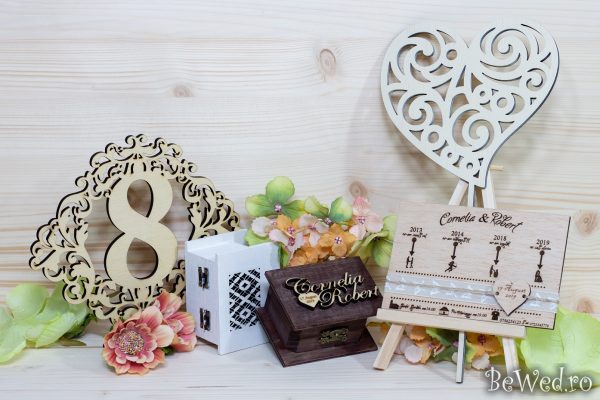 Realizam, prin debitare laser si gravura, modele unicat: invitatii pe lemn, invitatii puzzle, numere de masa; decoratiuni si cake topper, personalizate cu numele mirilor si data casatoriei.