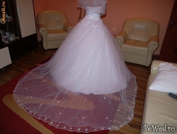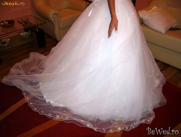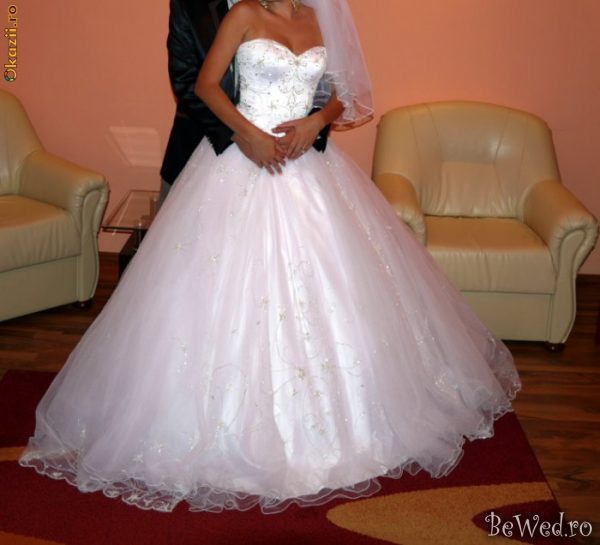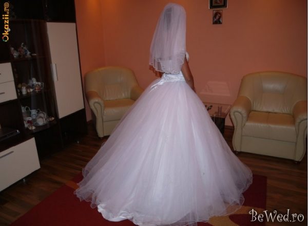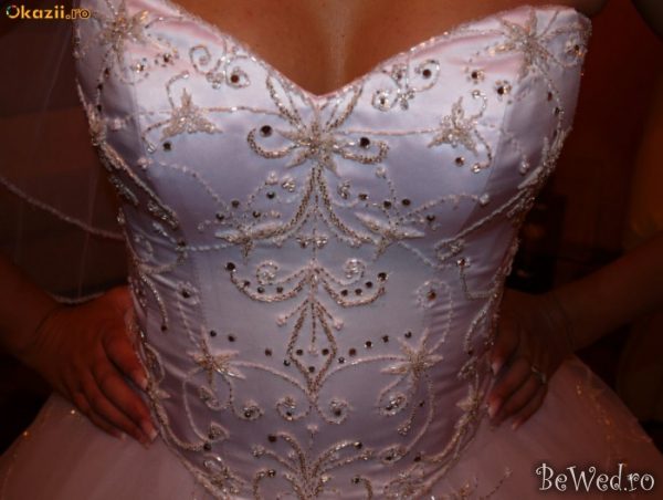 Rochia a fost purtata o singura data.Este facuta la comanda dupa un model Demetrios.Este brodata manual in totalitate, iar pe corset are aplicatii de cristale Swarovsky.Initial a costat 5700 lei(in pret fiind inclus si un voal brodat manual).Rochia merita vazuta.Pentru mai multe detalii puteti intra pe id-ul de YahooMessenger sweety_monik06.