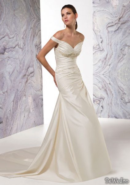 Modelul de rochie Cadence este croit special pentru a va scoate in evidenta latura sensibila dar sic inacelasi timp.Best Bride va ofera acest model spre inchiriere. Croiala simpla a rochiei este din satin cu corsetul in v ce se prelungeste pe linia corpului scotand in evidenta o silueta de invidiat, iar sub bust gasim aplicatii de cristale.Acest model are bretele ce cad usor pe umeri si trena ce poate fi prevazuta cu sistem de prindere.