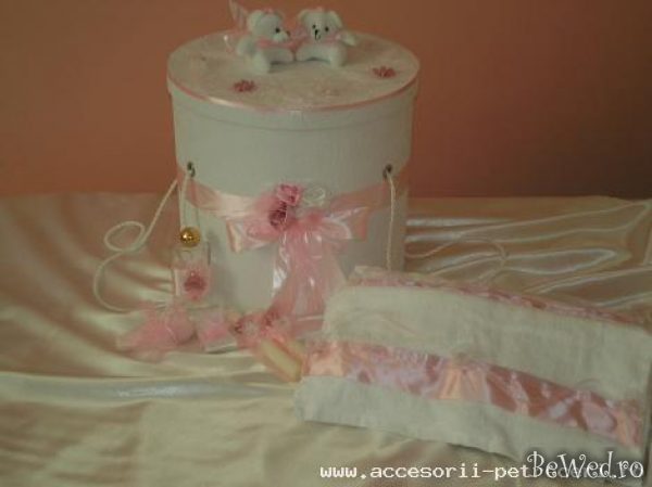 Un trusou deosebit pentru botezul celui mic. Trusoul este lucrat si decorat manul iar culoarea diferitelor accesorii se poate alege in functie de preferinte. La cerere se pot accesoriza conform unei tematici alese sau se poate personaliza cu numele bebelusui.