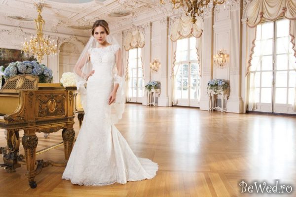 Rochia de mireasa Lillian West 6345 este o rochie extravaganta si sexy, avand spatele gol si un decolteu adanc, acoperit de o dantela brodata cu motive florale iesite subtil in relief. Rochia are o nuanta accentuata de stil si rafinament prin linia decolteului, umerii acoperiti, croiala realizata in partea din spate a rochiei si superba trena, ce desavarseste o creatie ideala pentru miresele cu personalitate, ce doresc sa atraga toate privirile.