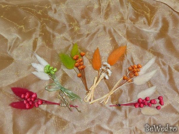 Cocarde realizate din flori uscate, stelute de mare, scoici si pene