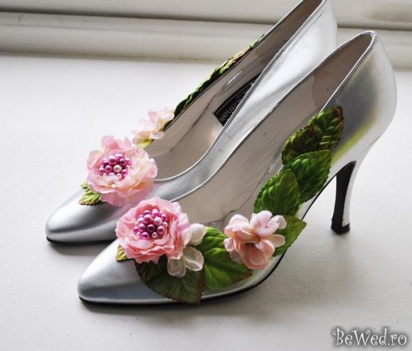 Pantofii pot fi accesorizati in acelasi ton, imaginea miresei fiind intregita machiaj, manichiura, buchet si bijuterii.
