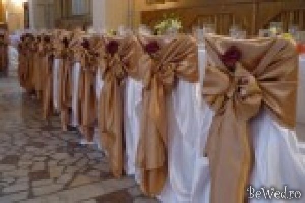 Firma noastra va ofera huse scaun cu esarfe diferite culori, arcada si stalpi intrare local, aranjament masa, perdea de lumini, aranjamente florale, baloane, cocarde, marturii, etc