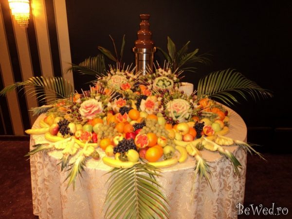 Fantana de ciocolata este o surpriza dulce pentru suprinderea invitatilor dvs. si aduce un plus de rafinament evenimentului, fie ca este folosita la un botez, o nunta eleganta in aer liber, o petrecere corporate sau o petrecere restransa in familie. De asemenea, puteti opta pentru un aranjament spectaculos ce cuprinde fructe sculptate, sculpturi in fructe, pepeni sculptati, aranjamente din fructe in diferite forme, completate de aranjamente florale.