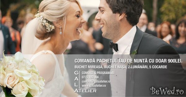 La GALA Atelier beneficiezi de pachetul complet de nunta cu doar 900lei. Acesta include buchet mireasa, buchet nasa, lumanari (orice stil si inaltime) si 5 cocarde.