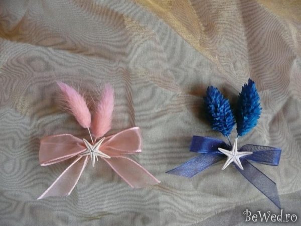 Cocarde realizate din flori uscate, stelute de mare, scoici si pene