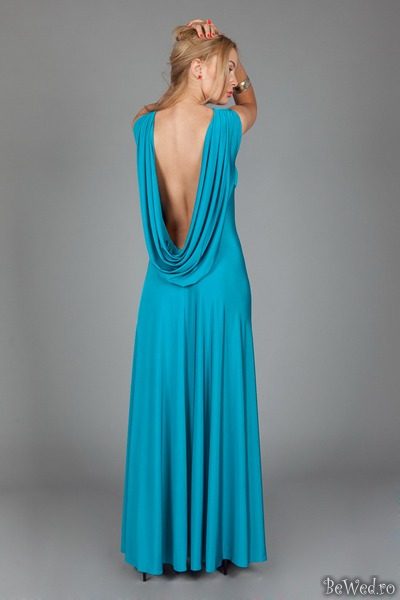 Rochie de seara eleganta cu spatele gol. Bustul fronsat si spatele cu falduri ample, adauga rochiei un plus de eleganta .